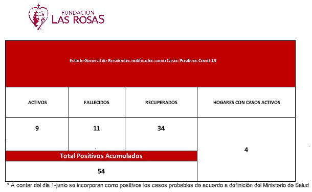 Fundación Las Rosas entrega a continuación el balance semanal con los residentes notificados como positivos para COVID-19, en sus 28 Hogares.