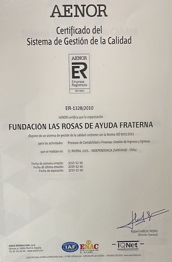 Fundación Las Rosas de Ayuda Fraterna está certificada, en sus procesos de ingresos y egresos económicos, bajo la norma ISO 9001:2015, estándar de certificación internacional que establece los criterios para un Sistema de Gestión de Calidad (SGC). Este estándar se basa en siete principios que incluyen un fuerte enfoque en el cliente, la motivación y la implicación de la alta dirección, el enfoque basado en procesos y la mejora continua.