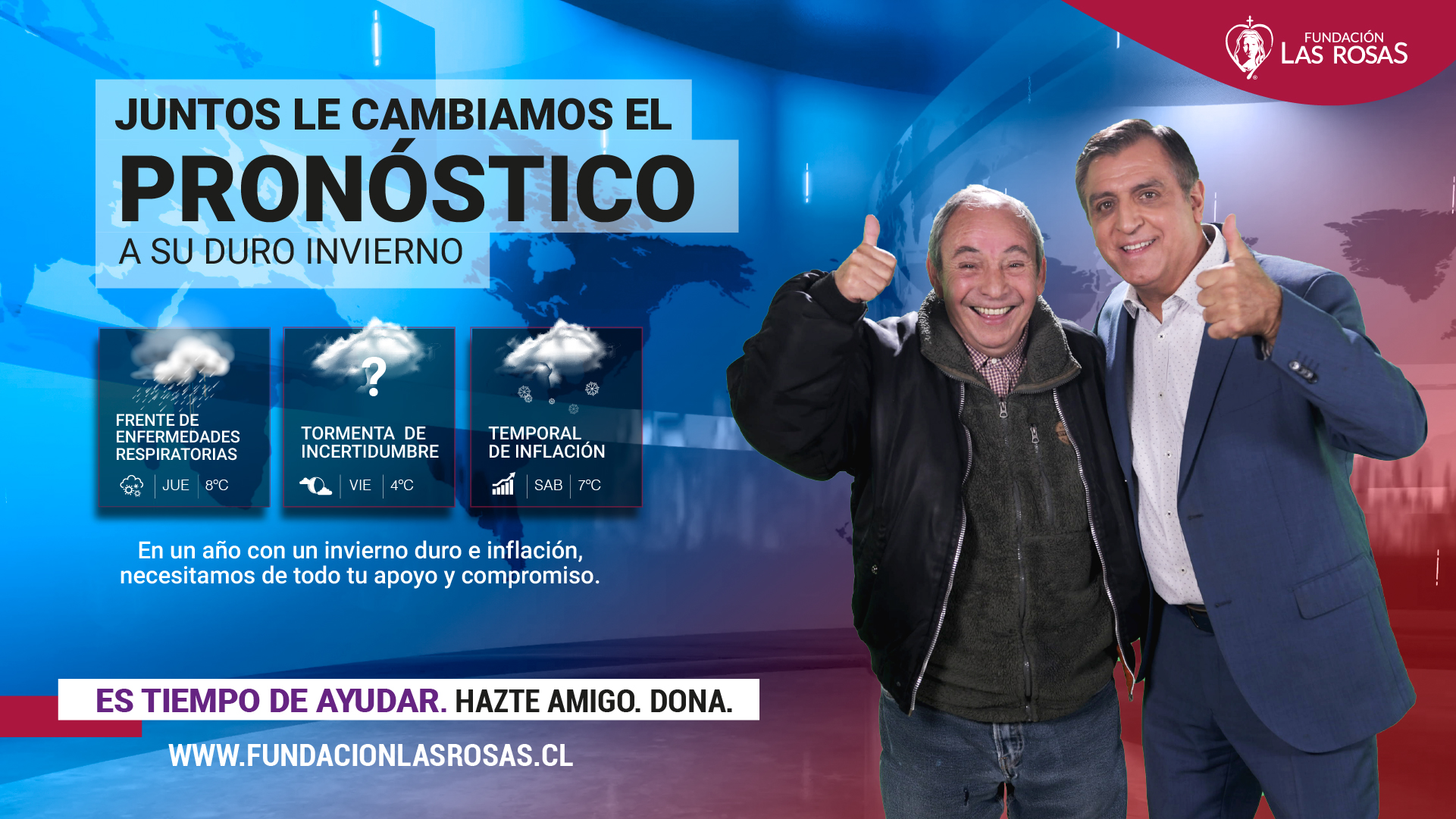 - “Juntos, le cambiamos el pronóstico a su duro invierno” es la invitación de la institución solidaria, con el objetivo de reunir donaciones que permitan enfrentar el frío y las enfermedades respiratorias propias de este tiempo. El llamado es a donar en el sitio web www.fundacionlasrosas.cl.