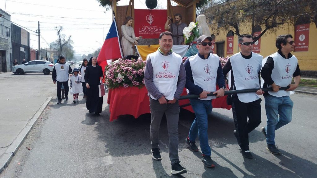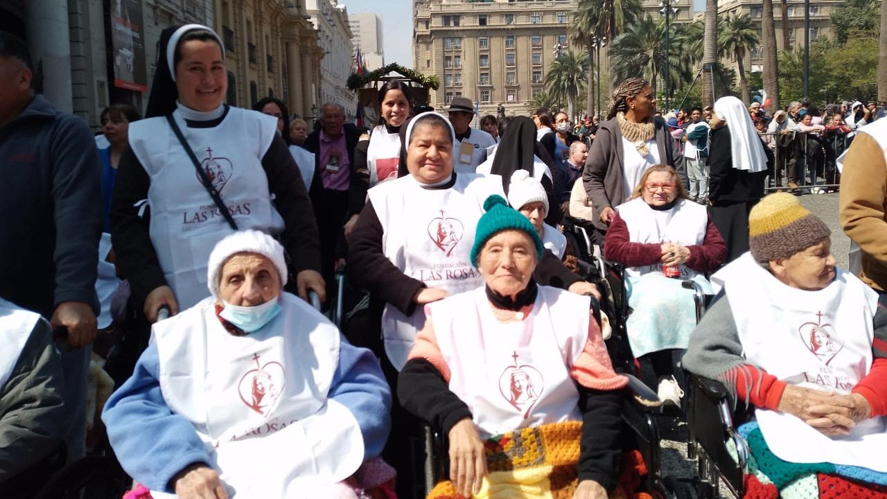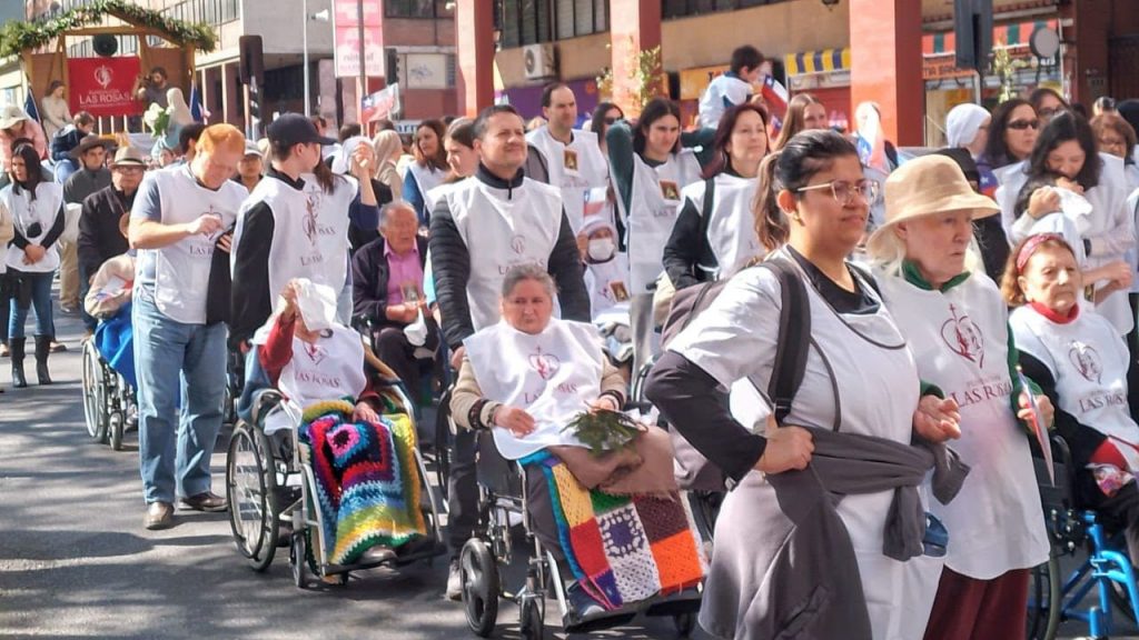 En la ocasión, nuestra comunidad conformada por Congregaciones Religiosas, Directoras de Hogares, Damas de Blanco, voluntarios, colaboradores y sus familias, junto a los hijos predilectos de nuestra Madre, los adultos mayores, caminaron entusiastas por las calles del centro de Santiago, guiados por el Capellán Nacional de Fundación Las Rosas, Pbro. Carlos Irarrázaval, al encuentro con nuestra Madre y Patrona.